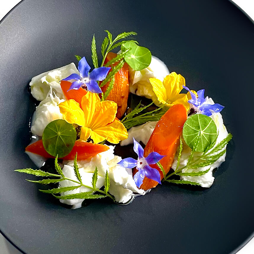 Grilled seasonal vegetables with burrata cheese from Puglia, beetroot and roasted onions