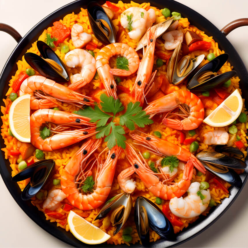 The chef will prepare a traditional Paella Valenciana with seafood (langoustines, prawns, squid and scallops)